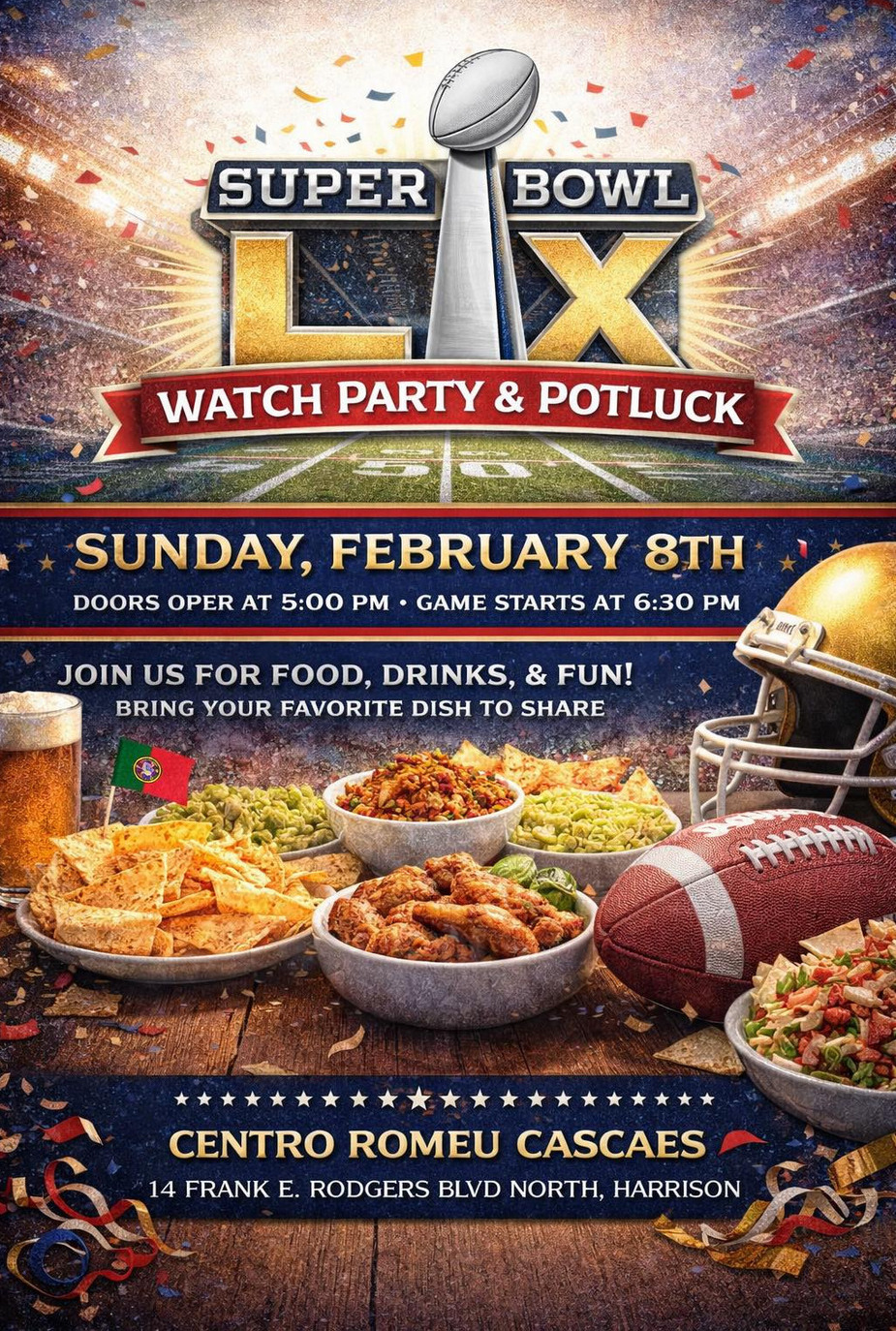 Football fans, food lovers and neighbors looking for a lively Sunday evening are invited to the Centro Romeu Cascaes Portuguese American Community Center (CRC-PACC) for a Super Bowl Watch Party and Potluck on Sunday, February 8, 2026 as the biggest game in American sports takes center stage.